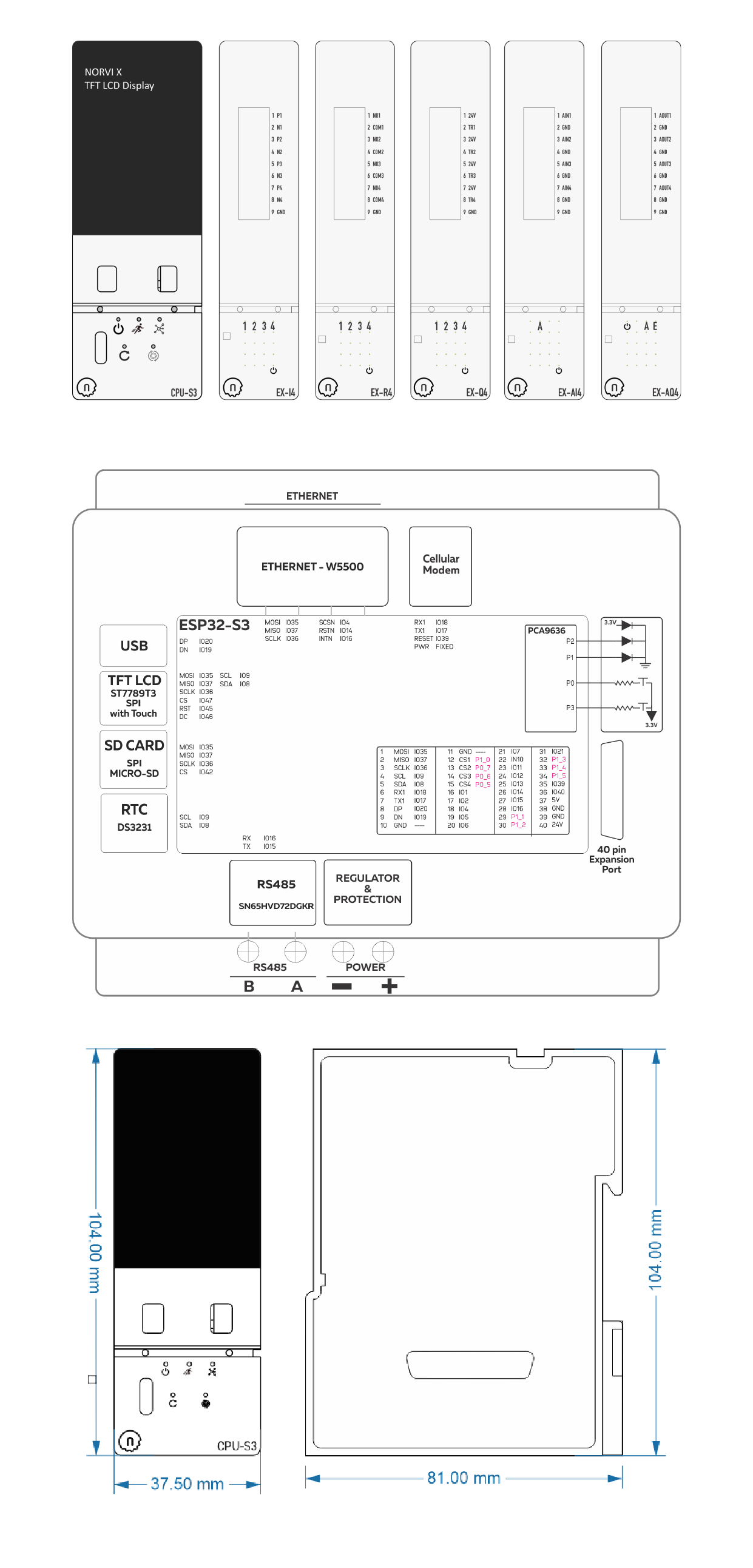 The NORVI X CPU module is based on the ESP32-S3-WROOM and includes a 2.0-inch TFT touch display, built-in RS-485, Ethernet, Wi-Fi, Bluetooth, and a DS3231 RTC. It mounts directly on DIN rail and uses push-in terminals for quick installation. As a result, the NORVI X fits seamlessly into industrial panels, OEM machines, and distributed automation architectures.