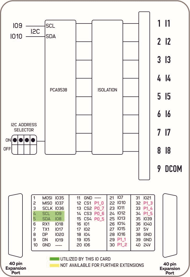 At its core, the module integrates a PCA9538 I²C port expander, allowing the NORVI X CPU to read input states efficiently via the internal expansion bus. With four selectable I²C addresses, up to four DI8 modules can be connected on the same bus, providing a total of 32 digital inputs per controller.
